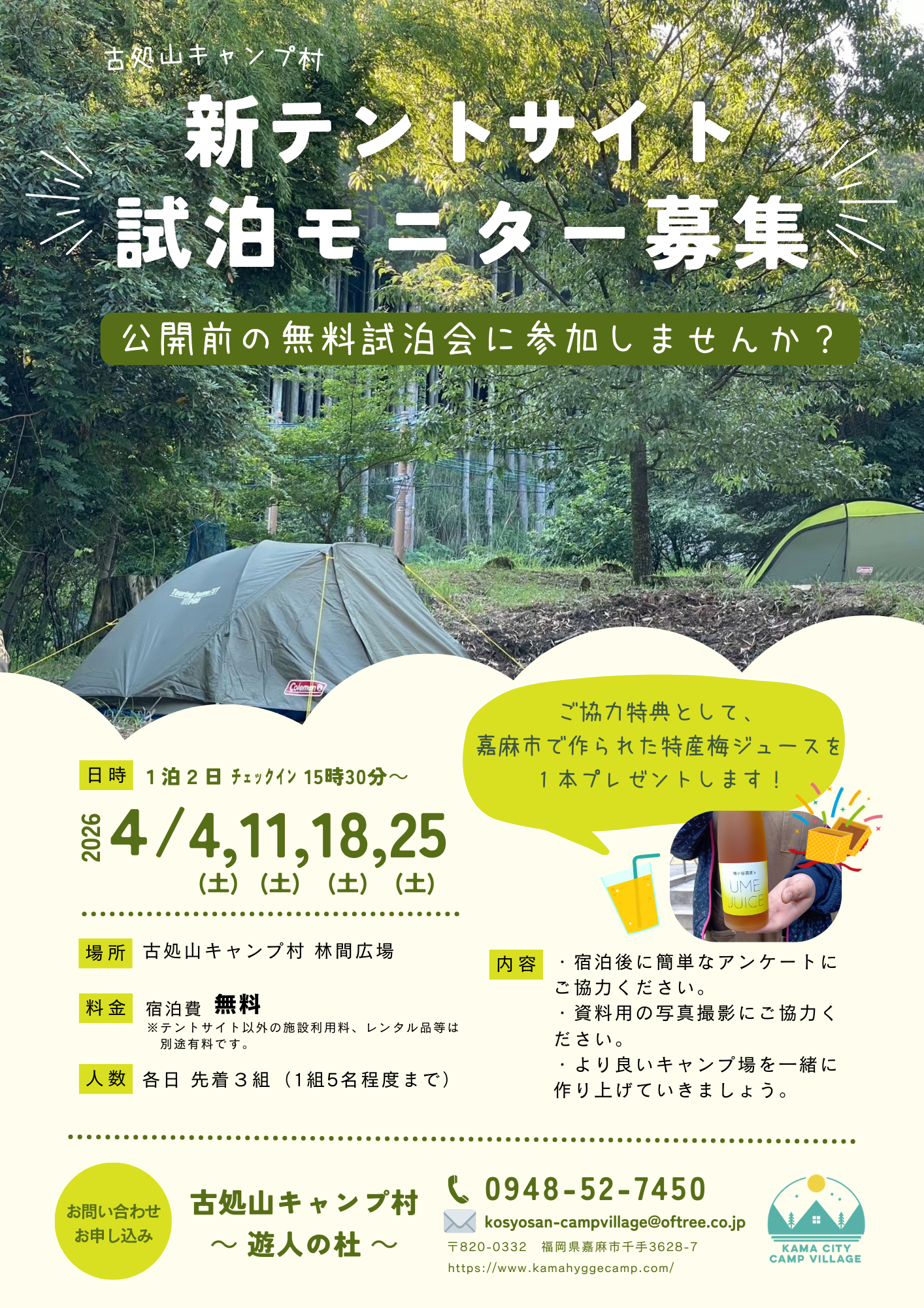 林間広場にて新テントサイトの運用開始を検討しています。 実際に泊まっていただいて区画の雰囲気や使い心地を体験していただけませんか?👀 澄んだ空気と、春のはじまりの景色をぜひお楽しみください🌸 モニターにご協力いただいた方 […]